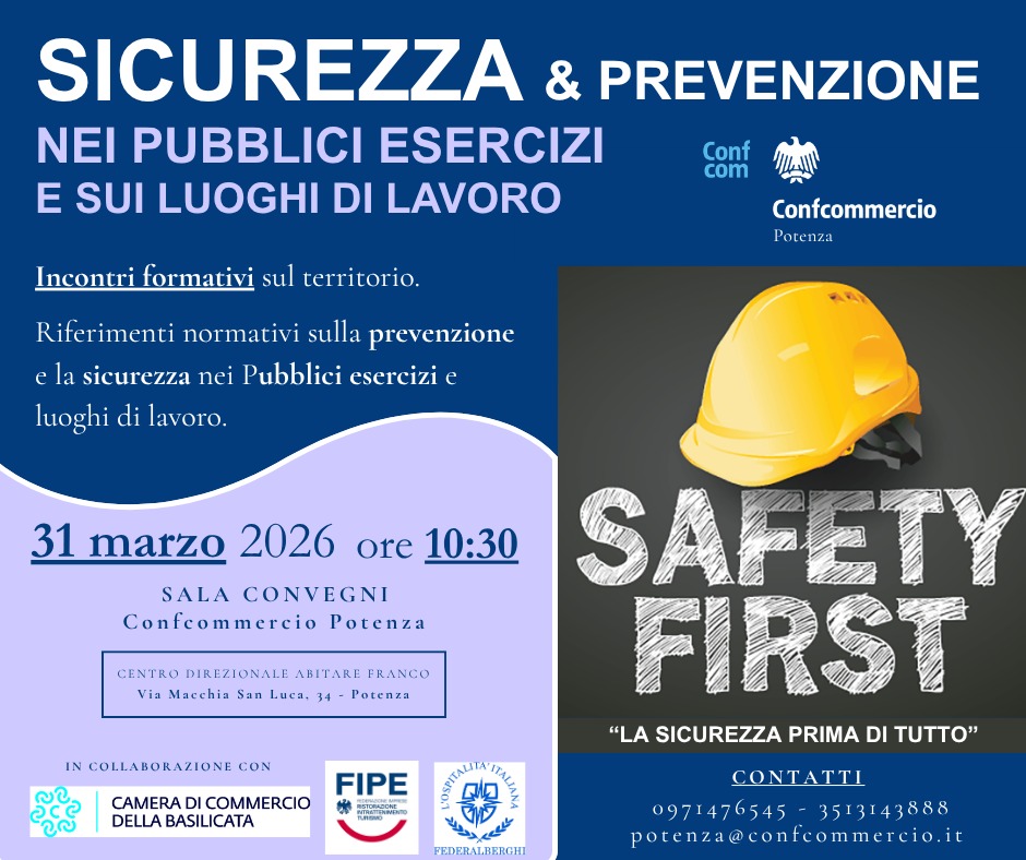 Proprio per rafforzare la cultura della sicurezza, Confcommercio Potenza ha promosso un ciclo di incontri formativi in collaborazione con Camera di Commercio della Basilicata, FIPE e Federalberghi. Il primo appuntamento è fissato per martedì 31 marzo alle ore 10.30, presso la sala convegni della sede Confcommercio al Centro direzionale Abitare Franco di Potenza. Gli incontri affronteranno in modo operativo i riferimenti normativi sulla sicurezza nei luoghi di lavoro e nei pubblici esercizi, con particolare attenzione alla prevenzione incendi, alla gestione delle emergenze e alla corretta configurazione delle attività di intrattenimento.