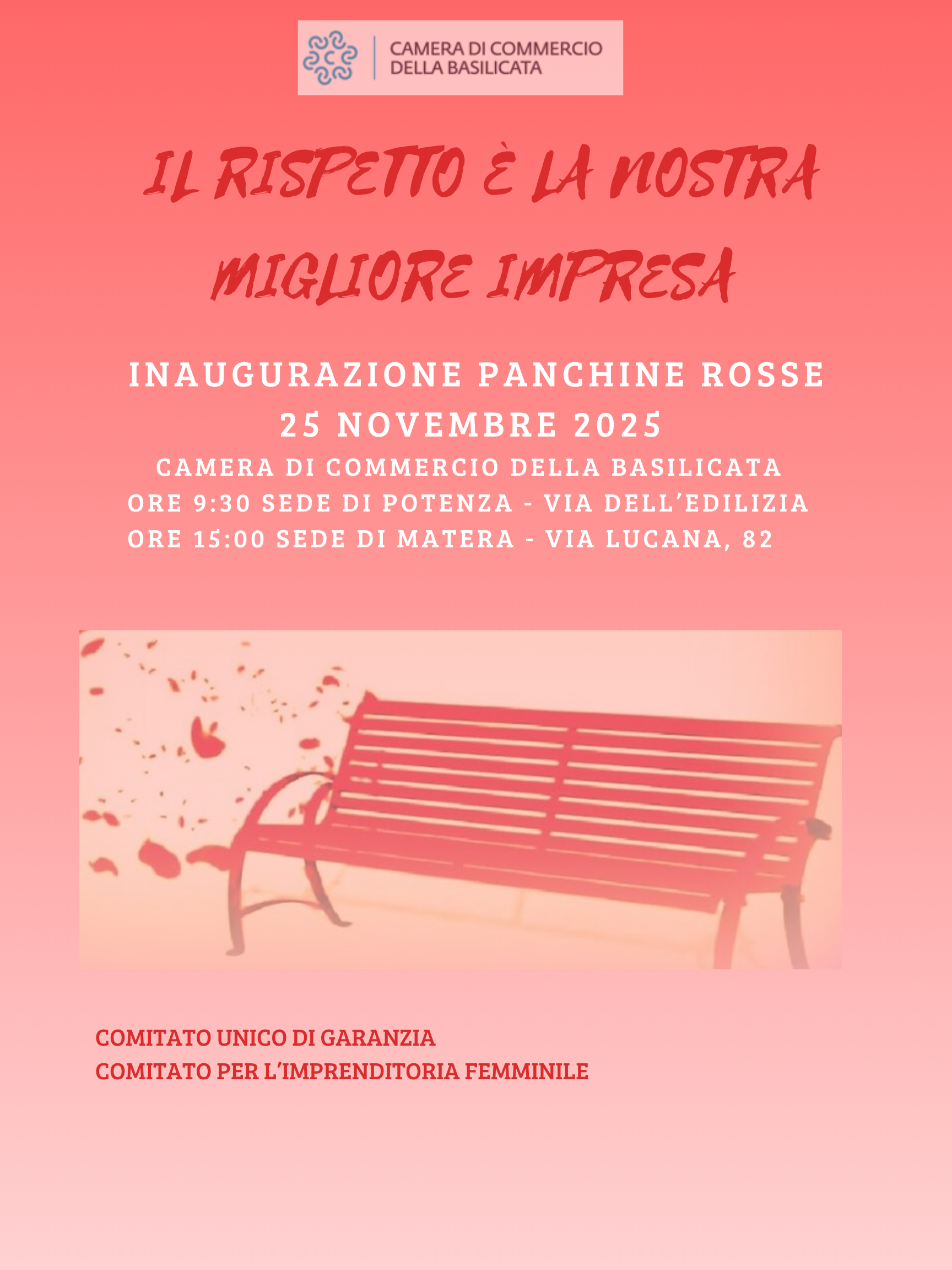 In occasione della Giornata internazionale per l’eliminazione della violenza contro le donne, martedì 25 novembre, la Camera di commercio della Basilicata inaugurerà due panchine rosse: una presso la sede di Potenza in via dell’Edilizia e l’altra presso la sede di Matera in via Lucana, quale simbolo universale della lotta contro la violenza sulle donne.