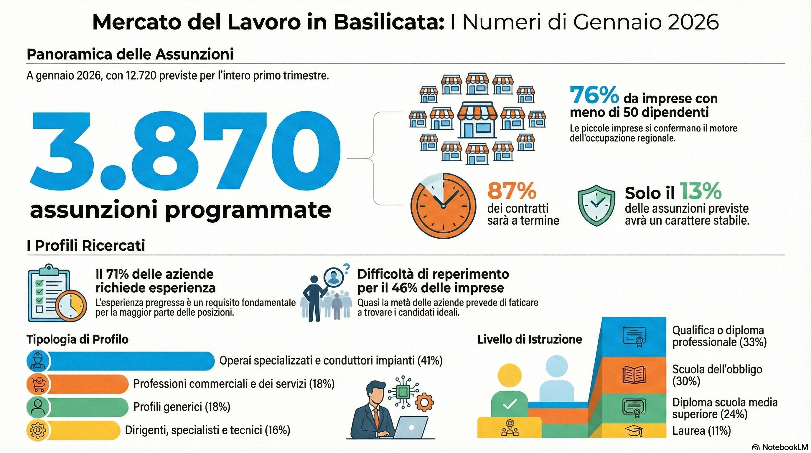 Secondo le ultime rilevazioni del Sistema Informativo Excelsior, realizzato da Unioncamere in accordo con il Ministero del Lavoro e delle Politiche Sociali, le prospettive occupazionali per la Basilicata all’inizio del 2026 mostrano un dinamismo focalizzato su settori specifici, seppur con persistenti sfide nel reperimento dei profili. Per il mese di gennaio 2026, le imprese lucane hanno programmato circa 3.870 entrate e, allargando l’orizzonte al primo trimestre dell’anno (gennaio - marzo 2026), il volume complessivo delle assunzioni previste sale a 12.720 unità.