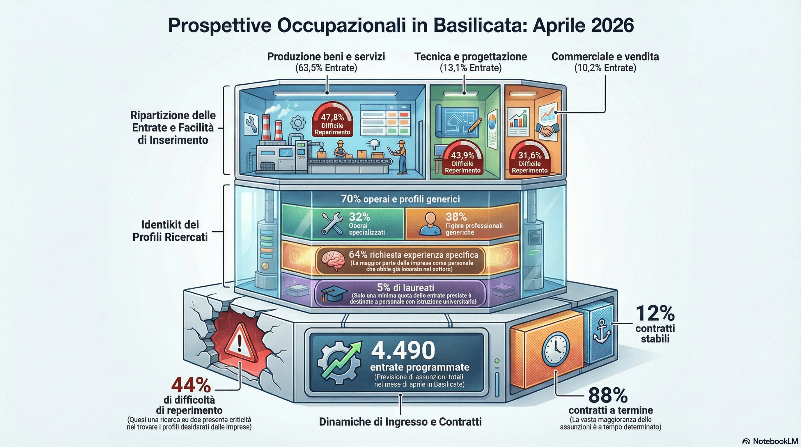 Per quanto riguarda i profili professionali richiesti, si nota una forte prevalenza di figure operative: profili generici: 38%; operai specializzati e conduttori di impianti: 32%. dirigenti, specialisti e tecnici: solo l’8% (dato inferiore alla media nazionale, che si attesta sul 14%).